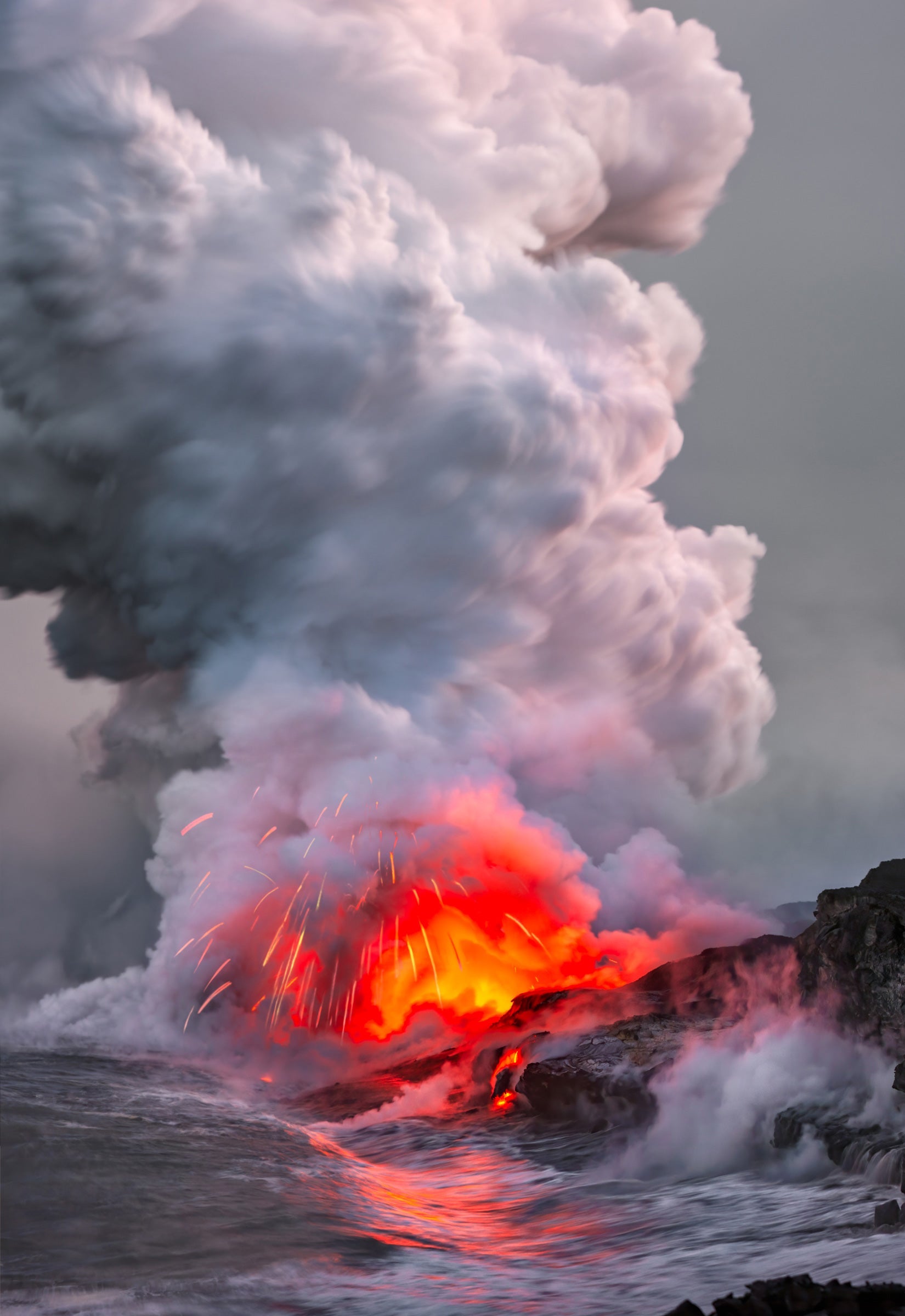 Emerging from the same awe-inspiring moment as Pele’s Whisper, this image captures the raw clash of fire and water in stunning vertical form. While the fiery lava carves its path with relentless energy, the sea rises to meet it with equal ferocity—a vivid portrayal of Namaka’s defiance against Pele’s advance. The mist and steam, born from their collision, echo the unending power struggle between these elemental forces.