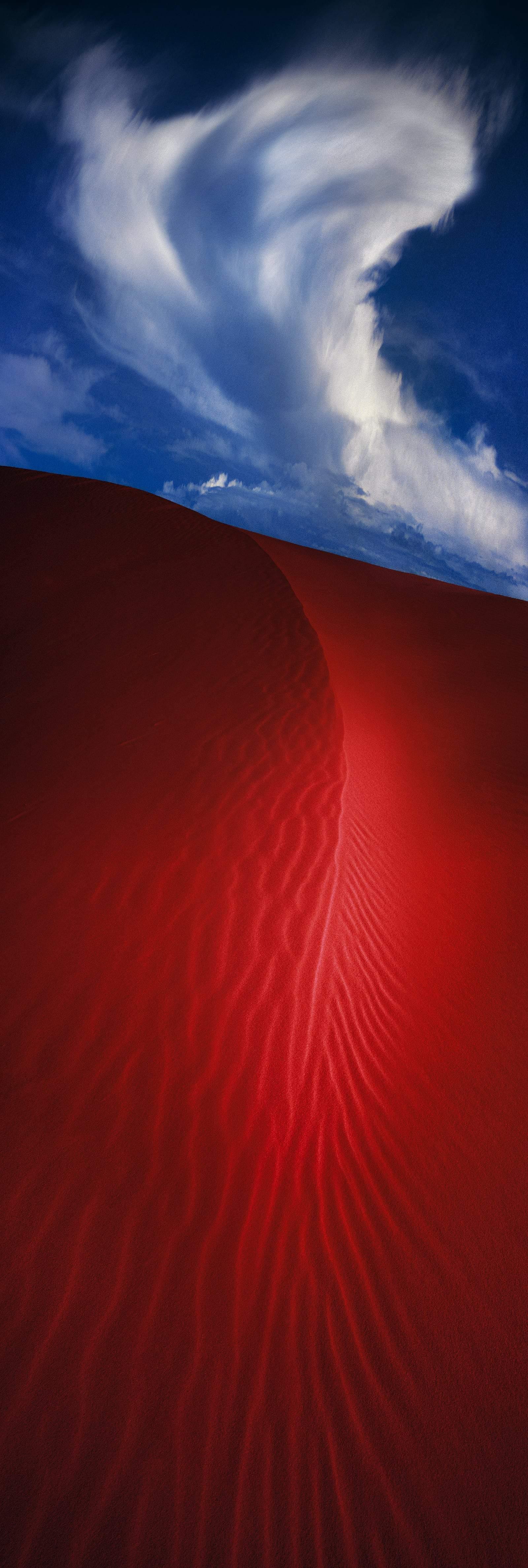 When shooting in the desert, I am always searching for that perfect, dramatic moment. Braving 100+ degree heat to find the right ridge, I settled on a spot, set up my tripod, and waited for the clouds in the distance to roll in toward me. I was completely caught up in the presence of this moment with the clouds overhead and the ripples in the sand thatched up like the Earth’s spine, capturing the retreating light and casting an imposing shadow. Shooting a vertical composition allowed me to capture the magic and power of the moment, giving the shot a sense of immense strength.